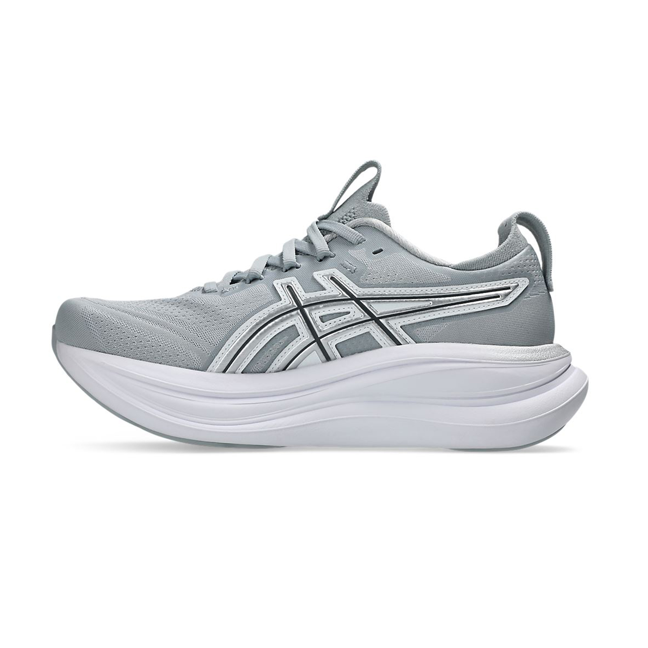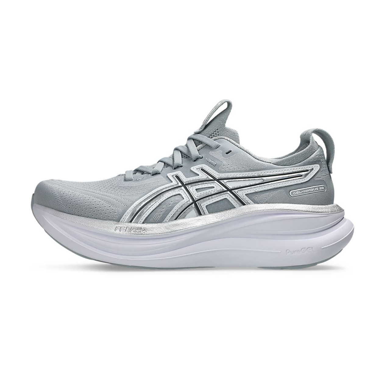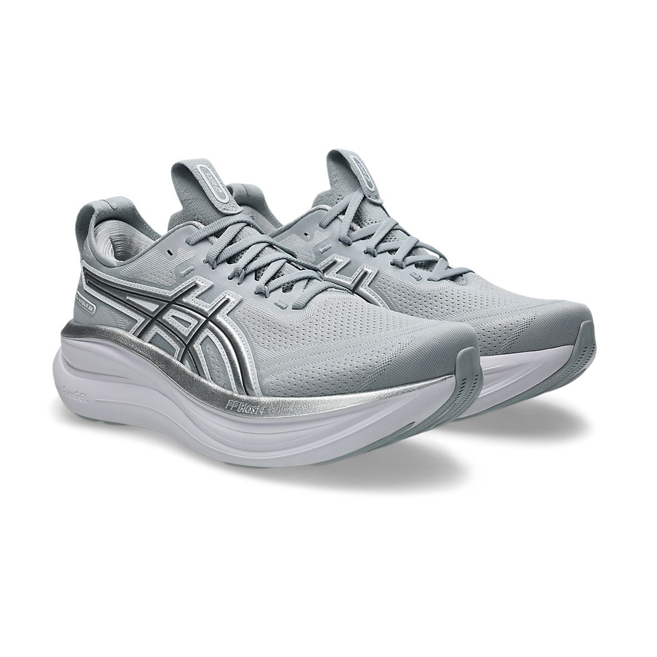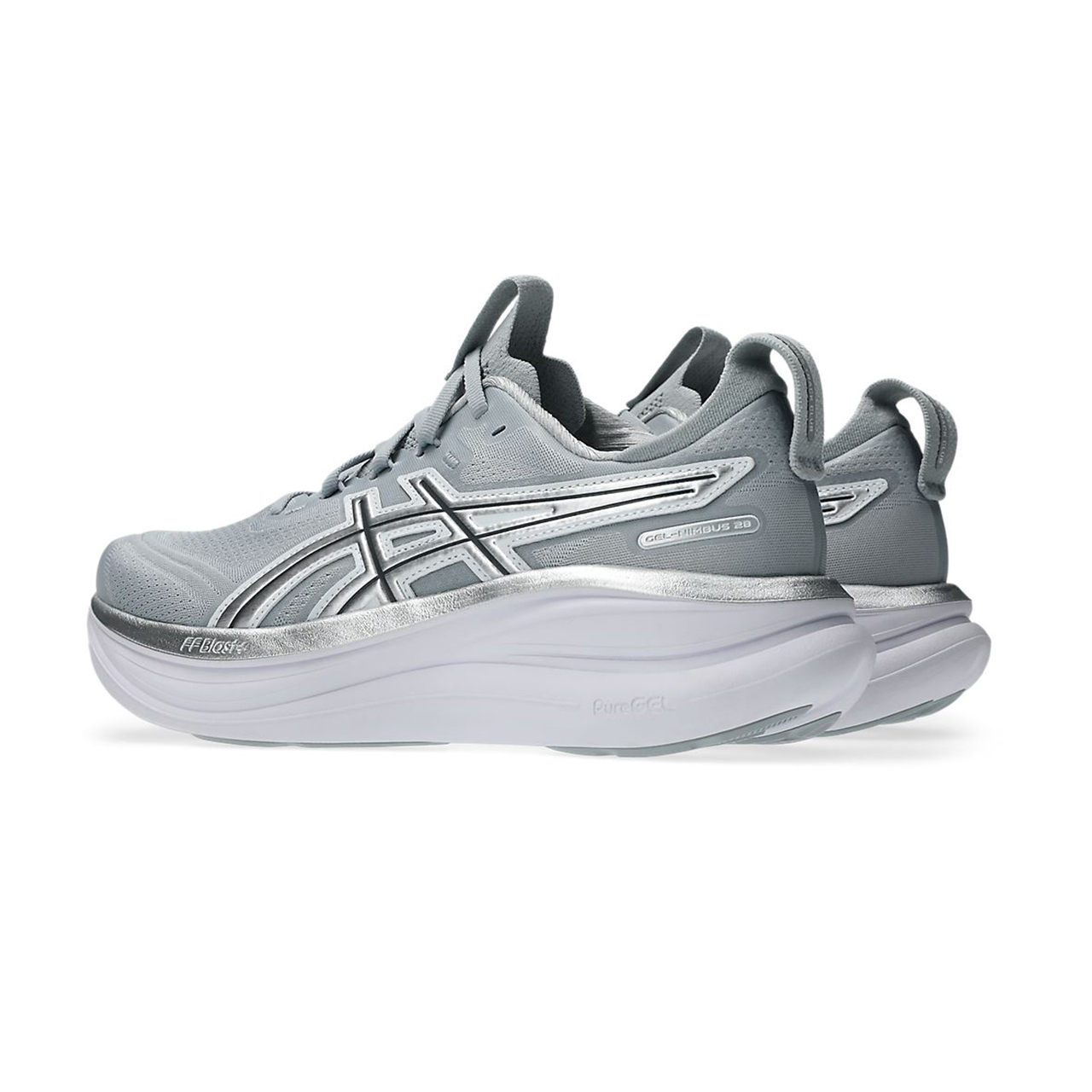 GEL-NIMBUS 28 ATC復古系列,採用針織網布鞋面,搭配象徵千禧年風格的金屬光澤LOGO,